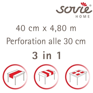 Bordløberen har en svag perforering hver 30 cm. Således kan den enten bruges som kuvertløber der lægges på tværs af bordet eller som dækkeservietter. Kan opdeles i 16 dækkerservietter.